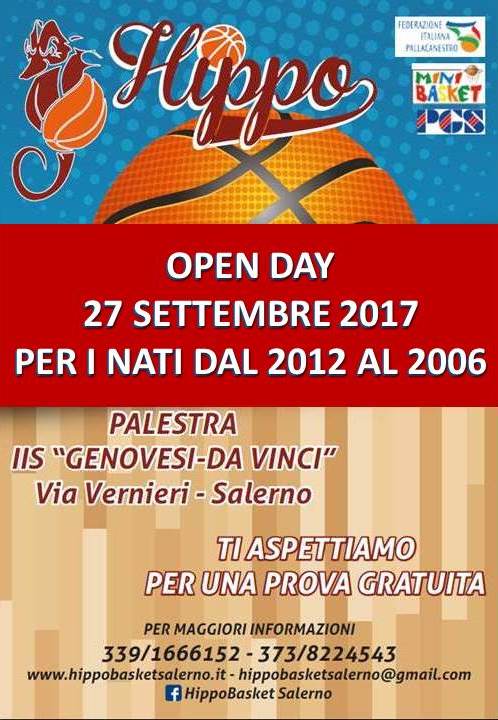 E’ tutto pronto per il 2^ Open Day del MiniBasket della Hippo Basket Salerno. La seconda giornata di presentazione delle attività per la stagione 2017/2018 è fissata per mercoledì 27 settembre, a partire dalle ore 16.Bambini/e e ragazzi/e nati/e tra il 2012 e il 2006 sono invitati con le loro famiglie presso la palestra dell’IIS “Genovesi-Da Vinci” (ingresso dalle scalette di via Vernieri) per un pomeriggio di giochi e sano divertimento all’insegna della palla a spicchi!