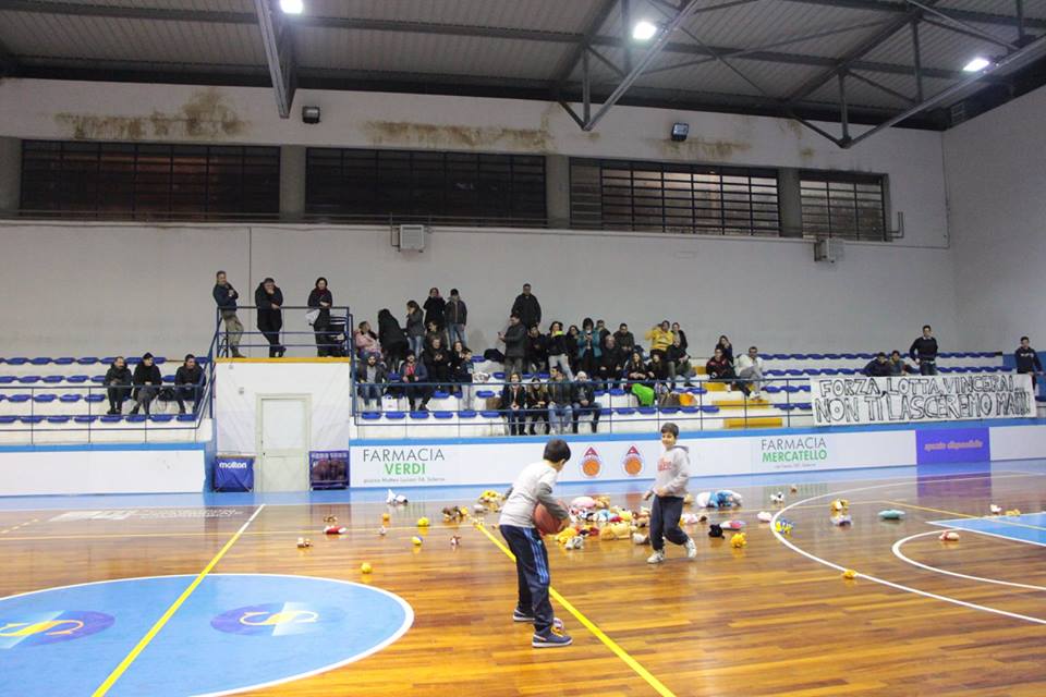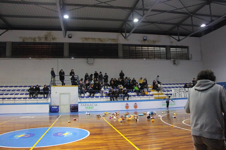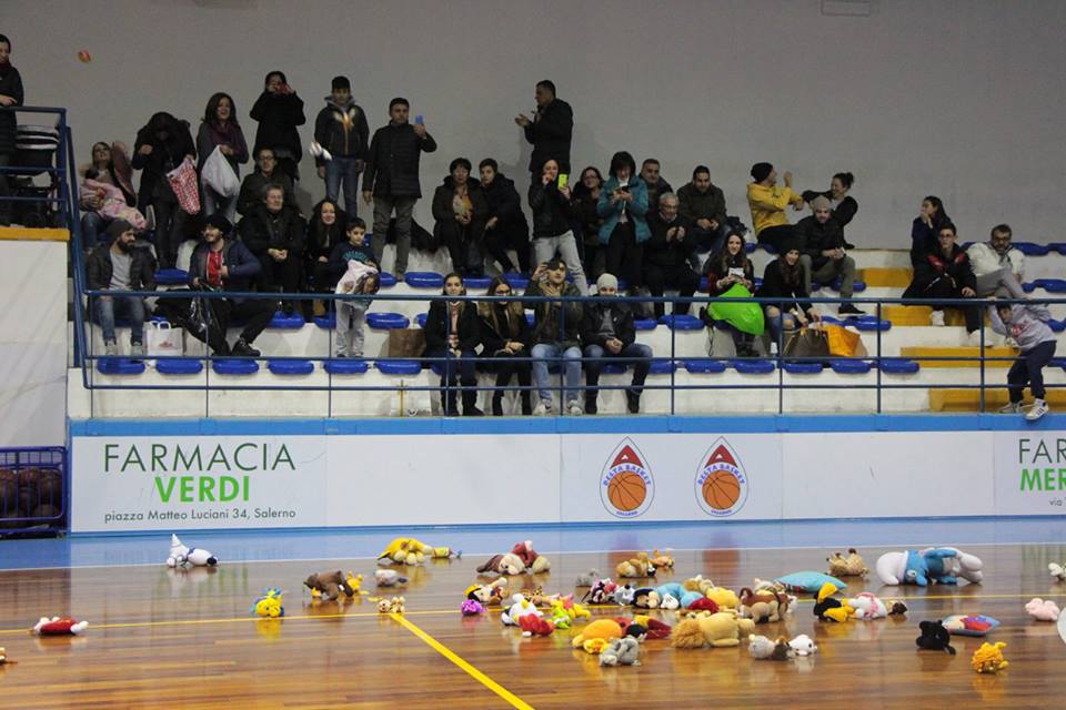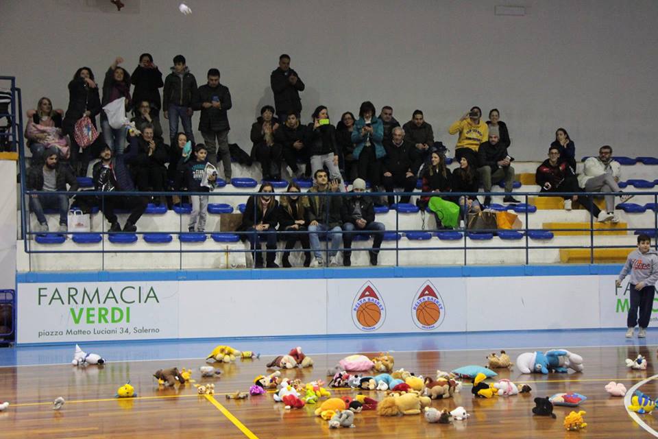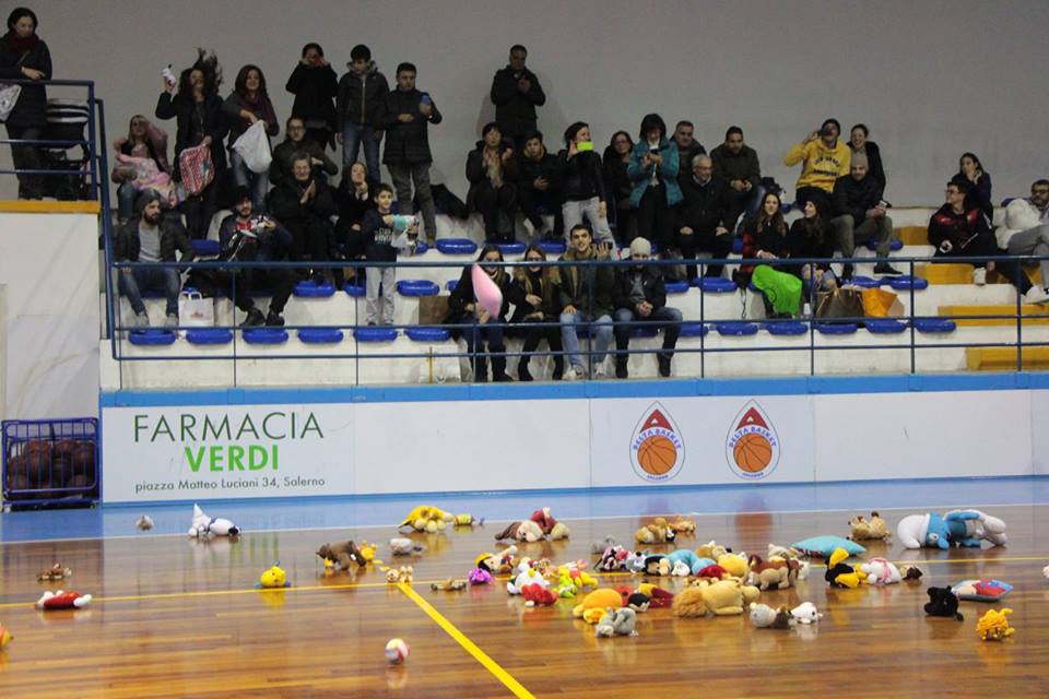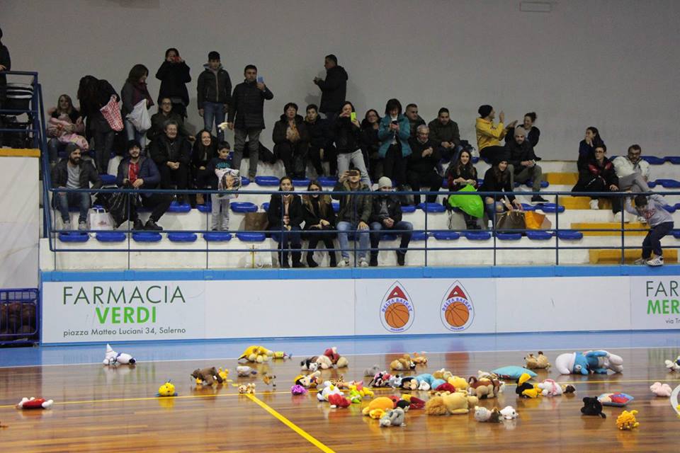 Nel secondo periodo, invece, il team allestito dal diesse Giovanni Carmando preme sull’acceleratore. Nasce, come spesso accade, tutto dalla difesa. I padroni di casa stringono le maglie difensive, concedendo ai viaggianti solo 4 punti, e ripartono velocemente in contropiede grazie alla regia ordinata di Bellucci ed Hernàndez, esaltando le qualità in campo aperto di Capozzi e Nigro. I granata si aggiudicano il parziale (17-4) e scavano un break che gli ospiti non riusciranno più a ricucire. All’intervallo lungo, dunque, la Hippo è avanti 35-19. Come concordato con gli arbitri e gli avversari, al fischio dei direttori di gara si scatenano i tifosi accorsi a Matierno per il primo “Teddy Bear Toss” organizzato dalla Hippo: sul parquet piovono centinaia di peluche che la società del presidente Frascino provvederà in questi giorni che precedono il Natale ai bambini ricoverati presso l’ospedale “San Giovanni di Dio e Ruggi d’Aragona” di Salerno.